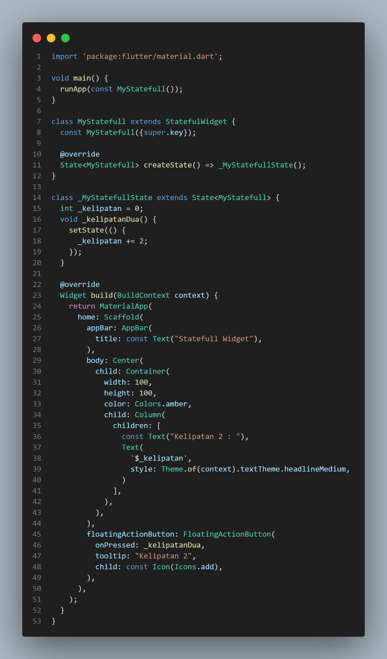 Statefull Widget merupakan widget dinamis yang ketika sebuah state berubah maka tampilan UI juga