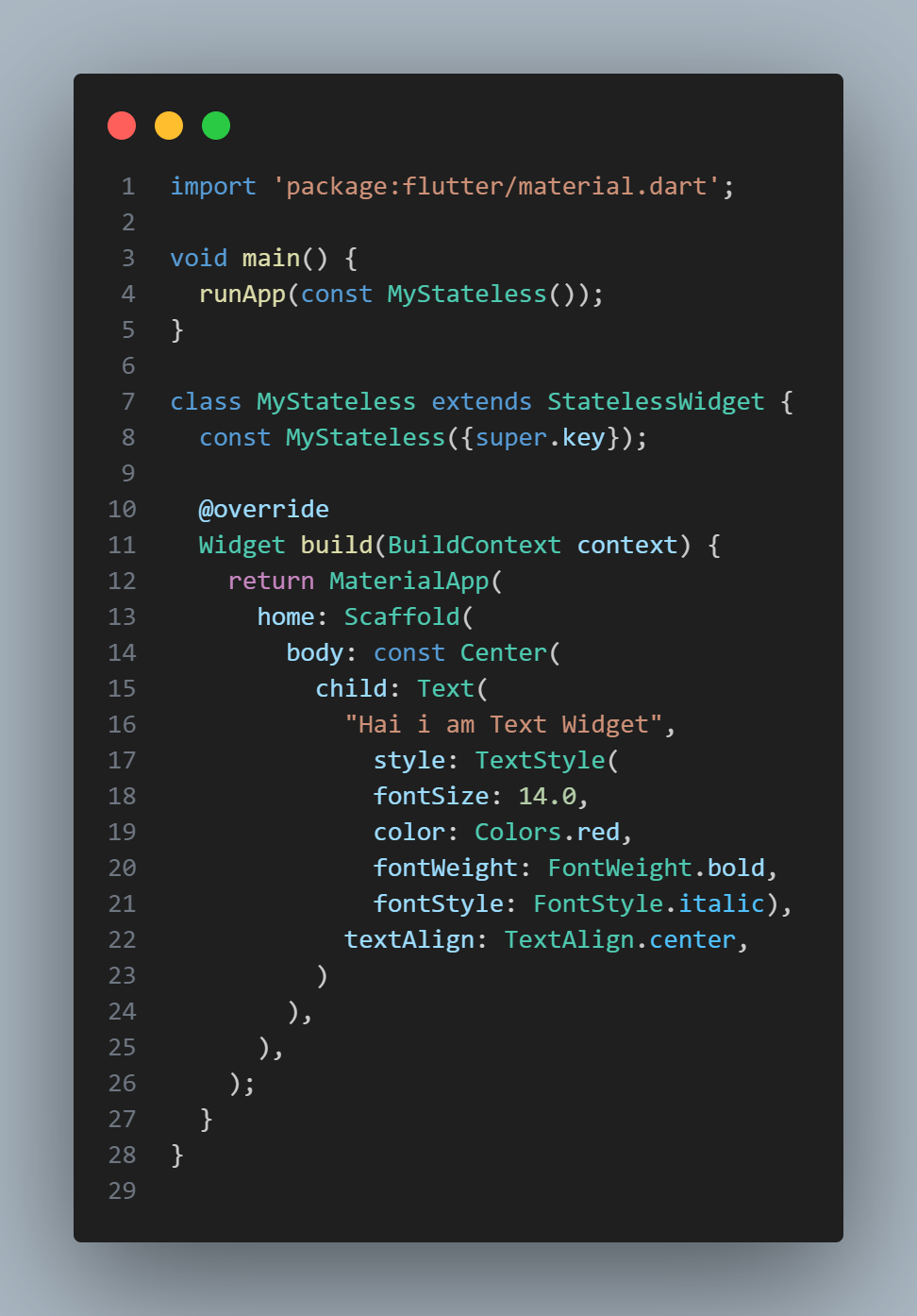 Stateless Widget merupakan widget yang data atau tampilannya tidak mengalami perubahan ketik
