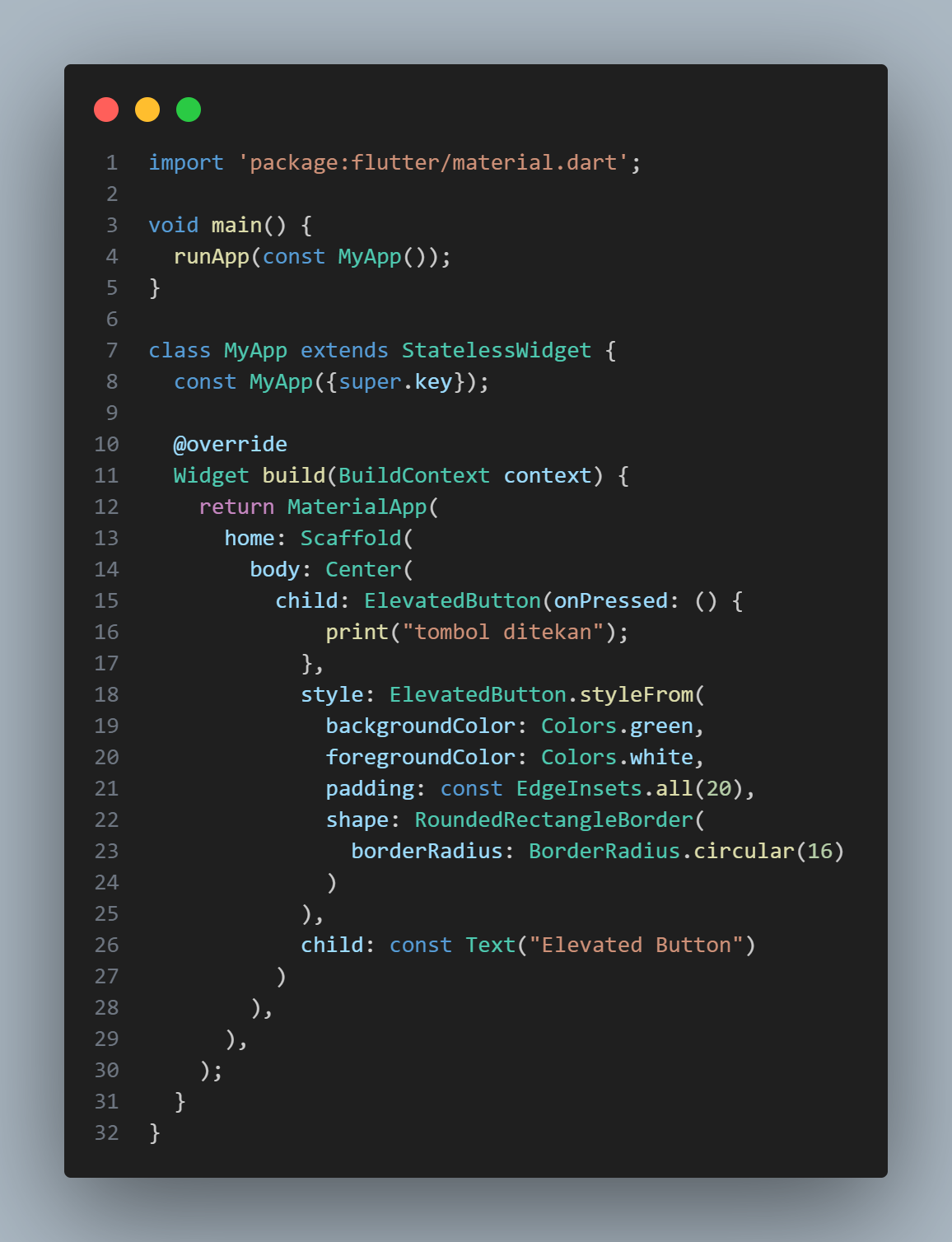 ElevatedButton merupakan widget yang mewakili tombol dan memiliki shadow