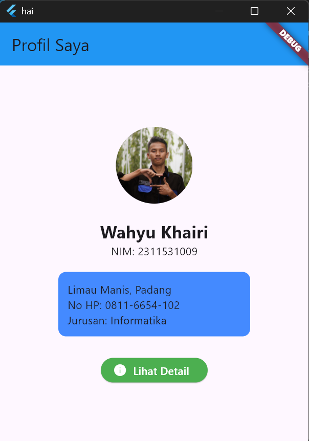 Buat tampilan profil berisi foto, nama, NIM, alamat, nomor HP, jurusan dengan mengimplementasikan seluruh basic widget.