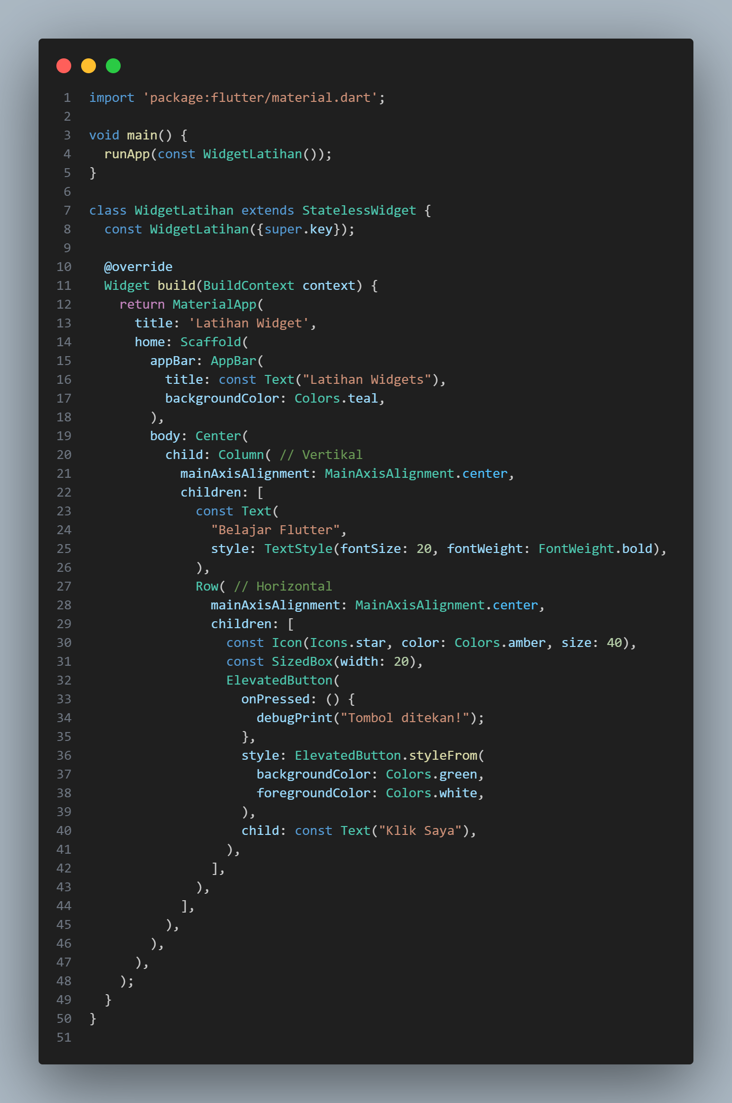 Buat tampilan widget secara vertikal dan horizontal dengan minimal 3 basic widget.