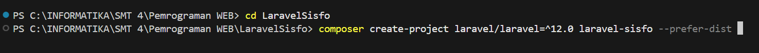 composer create-project laravel/laravel=^12.0 laravel-sisfo --prefer-distDi praktikum ini saya menggunakan composer untuk menginstall project laravel