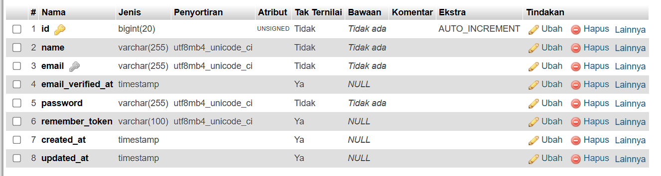 Authentication Laravel secara otomatis akan mengenerate table Users yang berisi tentang informasi data user, berikut struktur table users.