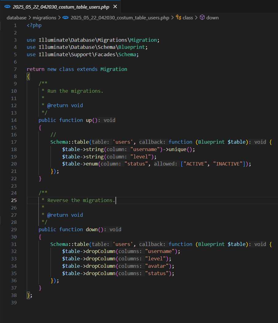 status, maka perlu membuat sebuah migration untuk menambahkan field-field diatas, ketikkan
