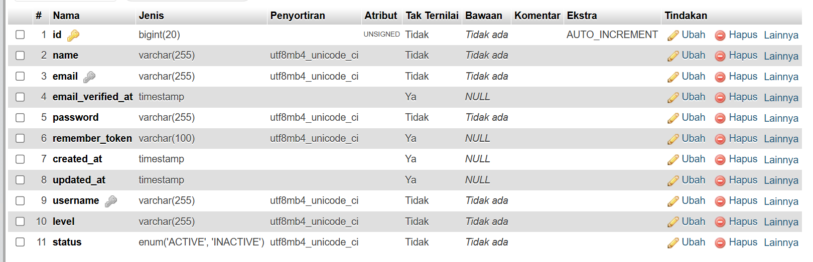 Dari stuktur table users diatas maka perlu ditambahken beberapa field yaitu username, level dan