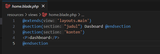 Untuk menggunakan layouts main menggunakan @extends('layouts.main') sehingga seluruh tampilan main.blade.php akan ditampilkan pada view home, untuk menampilkan data judul pada layout main dengan perintah @section('judul')Dashboard @endsection dan konten dengan cara @section('judul')Dashboard @endsection